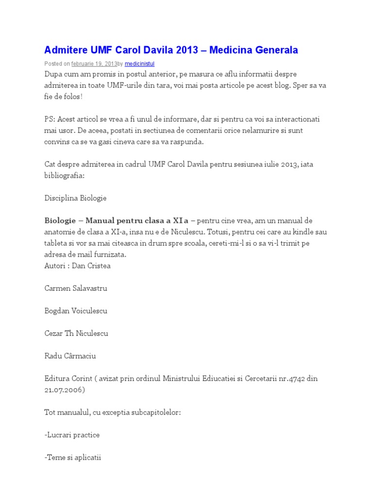 Vino să te formezi pentru profesia. Cartile acopera metadologia de pregatire pentru disciplinele biologie, disciplina obligatorie pentru toate profilele si fizica si chimie. Grupul medicinistilor și viitorilor medicinisti. Examenul de admitere la umf carol davila urmează să aibă loc pentru fiecare facultate în parte. Astia speciali au pachet bonus la carol davila de 10k eur cu toate examenele incluse, chiar daca ii mai lasa la restanta de ochii lumii cele mai mari javre, carol davila.