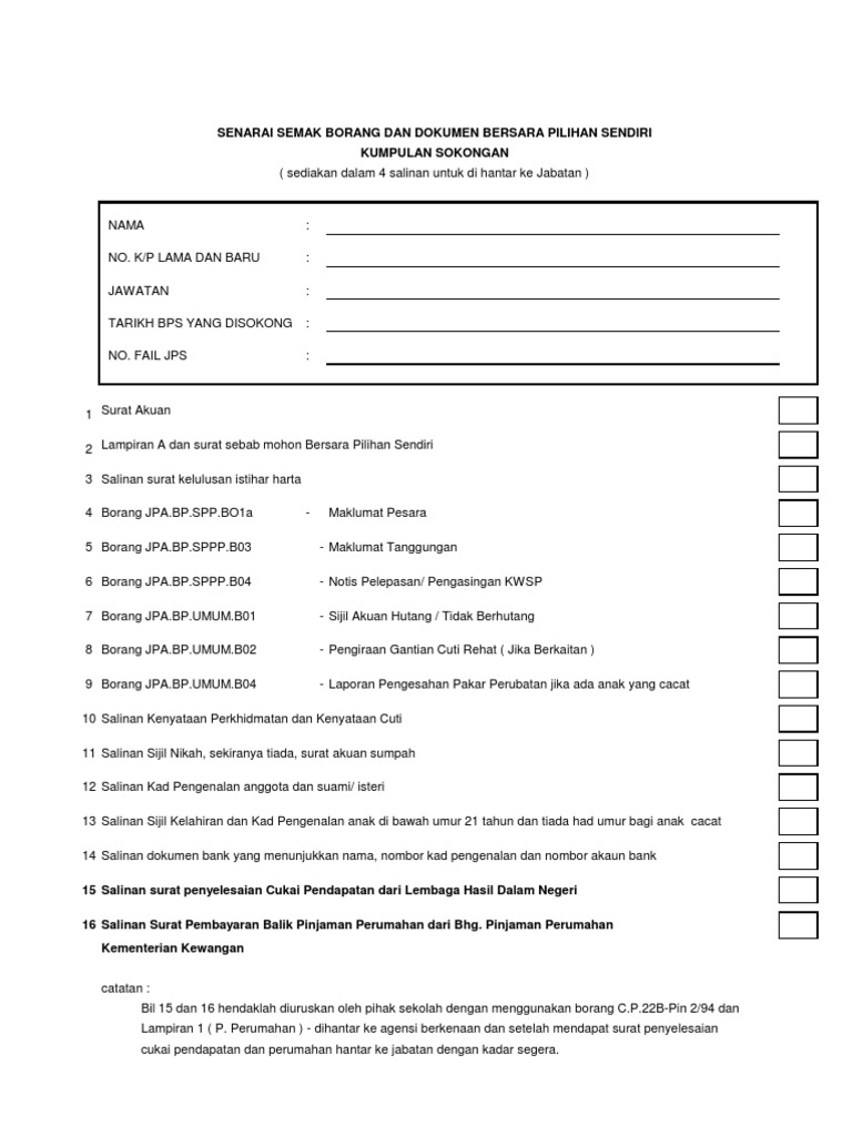 Senarai Semak Borang Bersara from imgv2-2-f.scribdassets.com We did not find results for: Contoh surat mohon bersara pilihan. Maybe you would like to learn more about one of these? Check spelling or type a new query.